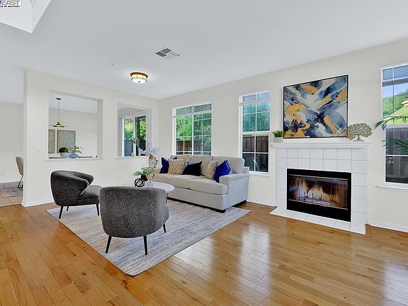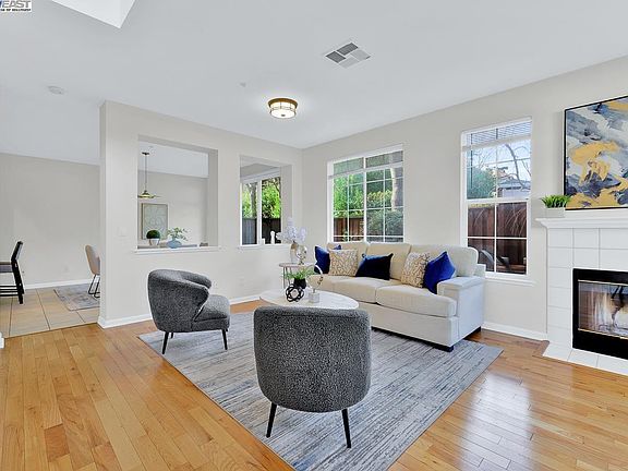 Beautiful North East Facing End Unit Two-Story Townhome Style Condo in Desirable California Highlands Community of Dublin. This home features open floorplan with tons of natural light. Open concept living room with beautiful hardwood floors, cozy fireplace, high ceiling, lots of windows to draw in natural light. Formal Dining area with sliding door which leads to private landscaped backyard with no rear neighbors. Gourmet kitchen with lots of cabinetry, quartz countertop, stainless steel appliances. 3 spacious bedrooms upstairs with newly upgraded laminate flooring. Primary bedroom suite with walk-in closet, vaulted ceiling, dual vanities, water closet, and beautifully remodeled bathroom with designer tile surrounds and tile floors. Hall bath has also been updated with beautiful tile work. Enjoy community amenities like a pool/hot tub and greenbelt, plus proximity to hiking trails, parks, highly rated Dublin schools, BART, dining, and shopping. Convenient access to HWY 580/680 completes the perfect package. This home is ideally tucked away among the hillside of the community offering the perfect blend of tranquility and convenience. Move-in ready and a must-see!