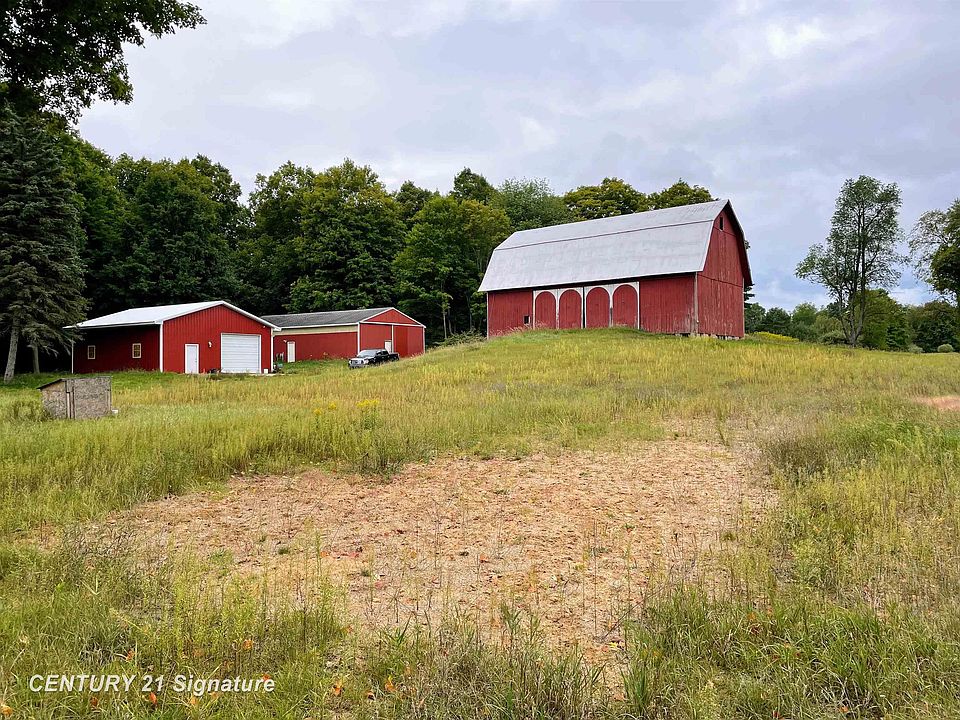Title work has been cleared up and property is now ready to be sold. Unique piece of higher land with lots of potential! Could be the perfect start to a HOMESTEAD. The rolling hills with mature trees could be perfect location for starting a DEVELOPMENT. Or run your SMALL BUESINESS out of the insulated out-buildings. So many possibilities here. The larger of the two insulated pole barns has running water from the NEW WELL. The hay/livestock barn is in great shape for its age. There are several acres that could be tillable. Approx. barn sizes: #1 - 30x40; #2 - 30x60; #3 - 30x55. Feel free to reach out with any questions. Vestaburg School district.