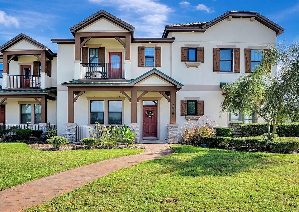 Ladies and Gentlemen, an opportunity has just presented itself in the new Windermere area. Whether you would like to walk to shopping and restaurants or take a short drive to the Horizon area, this special town home is sure to please. Welcome to the best view in relaxing Lakeside Village. As you drive past the newest Windermere shopping area, a special community is unfolding as you drive. A turn past the roundabouts and you are pulling into your oversized 2 car garage and driveway. You and your guests will admire the massive park and waterfront view while walking to main entrance of your home. As you walk through the front door, the magic begins. This former model town home is like walking into a designer tv show. Beautiful tile wood floors in the main foyer and bonus room to the left match your tastefully painted walls. An impressive stairwell and main foyer lead to the designer kitchen complete with stainless steel appliances and a built-in nook complete with your bistro table. A butler pantry with wine cooler and large pantry completes this cooking area that will certainly please the chef of the family complete with natural gas for cooking. This island allows ample space for seating and rolls into your enormous great room. This space can be configured for a formal dining room and family room but leave that option up to your imagination!!, A French door leads to your very private outdoor space with pavers and completely screened. This area is perfect for outdoor entertaining. Beyond the patio is your oversized 2 garage with tons of storage. A beautiful 1/2 bath completes the downstairs. When you're ready to retire for the evening, an impressive stairwell leads your oversized master suite that overlooks the water from a private balcony. The master bath complete with double sinks and a large walk-in closet are what you would expect Two large junior suites and a second full bath complete the upstairs area with brand waterproof laminate wood floors. You can admire the park and lake view during the day and stroll onto your second story balcony for Magic Kingdom fireworks in the evening. Make your private appointment today while the opportunity still exists.