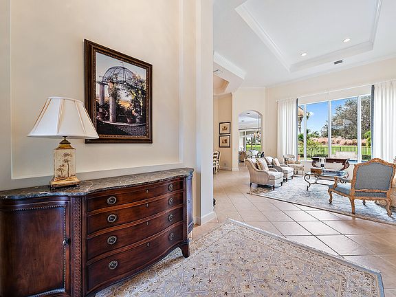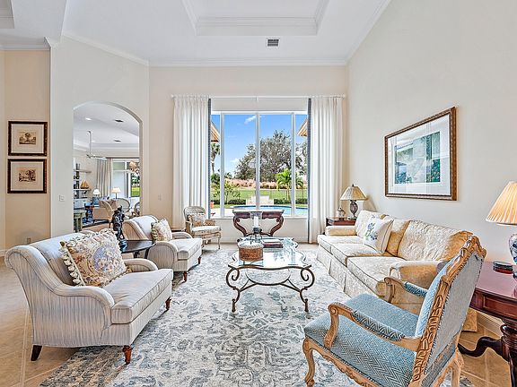 Everything you've been wanting in one fabulous designer-done, COMPLETELY FURNISHED home--including QUALITY FURNITURE, original artwork, high-end electronics, antiques, heirlooms, and more. An IMMEDIATE PREMIER GOLF MEMBERSHIP is available with this 3BR/3.5BA+Den ''Miramonte' located in the sought-after Isla Vista community in the Club at Ibis. With 3258 sf, this home was spectacularly updated between 2020-2023 and features new IMPACT GLASS throughout. The backyard was completely reimagined and now features all new Travertine marble pavers and turf, a refurbished saltwater pool with water feature (now with updated and automated equipment), and a newly screened-in lanai. The resort-like backyard receives sun for much of the day due to its Southern exposure. Private golf course views of Tradition #9 provide a beautiful backdrop, while offering immense privacy. The WHOLE-HOUSE GENERATOR offers protection and peace of mind along with the Impact Glass. Tasteful, warm, luxurious, quality, elegant, sophisticated, timeless are words the aptly describe the professionally done interior. Custom window treatments, designer fixtures, extensive moldings, soothing colors and so much more. Inside, every room has been thoughtfully and meticulously updated. The elegant cook's kitchen boasts 2020 GE Café appliances and an extra large pantry, rarely seen at this price point. The new dry bar features Quartz countertops, a Mother of Pearl back splash and new wine cooler. The focal point of the spacious family room is the 2023-built CUSTOM WALL UNIT providing amble display and storage. New engineered hardwood floors in the Primary Bedroom and Den. Enjoy a redone powder room with new vanity and designer wallpaper. New custom draperies throughout. The entire home has been freshly painted and crown molding has been installed throughout. All landscaping, hardscape, landscape lighting have been replaced, upgraded or added. The guest bedrooms feature new carpeting, new glass shower doors, new lights. New closet organizers added to all bedrooms. The hot water tank is new and features a recirculating function. Air conditioning has been added to the garage. There's also a safe in the Primary Suite. There are so many thoughtful, useful and elegant touches throughout this excellent quality, modernized home.
