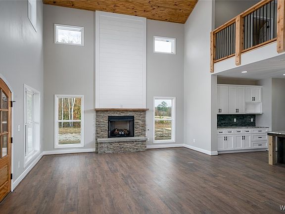 Escape to country living with this beautiful farmhouse on 5 acres, blending rustic charm with modern comforts. Featuring an inviting open concept layout, this home is perfect for both peaceful living and entertaining. The heart of the home is the stunning stone fireplace, creating a cozy atmosphere in the living area that’s perfect for chilly evenings or relaxing with family. The spacious living and dining areas flow seamlessly into a well-appointed kitchen, making it ideal for gatherings or everyday living. Large windows throughout allow natural light to fill the home, enhancing its airy and open feel. Step outside and enjoy the expansive wrap-around porch, offering a serene setting to relax and take in the beautiful surroundings. With plenty of room for rocking chairs, swings, or a cozy outdoor dining area, the porch is the perfect place to enjoy your morning coffee, watch the sunset, or simply unwind after a long day.