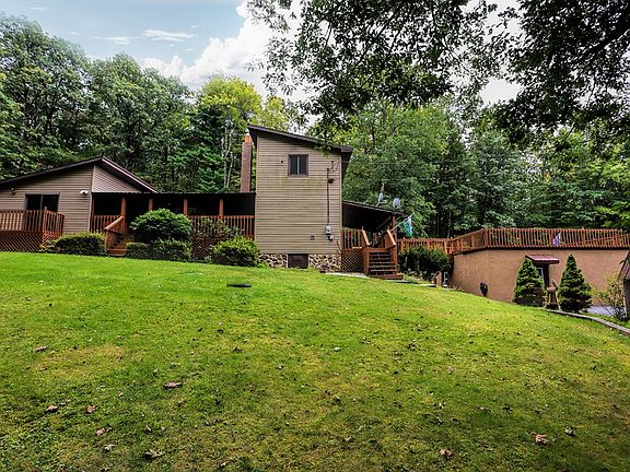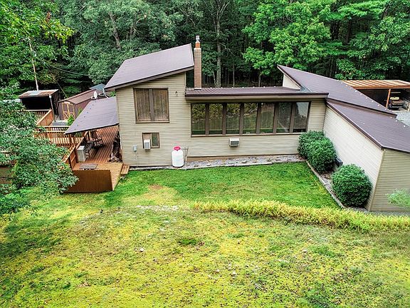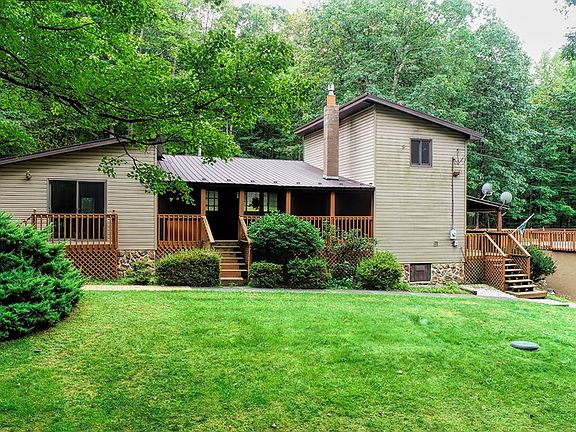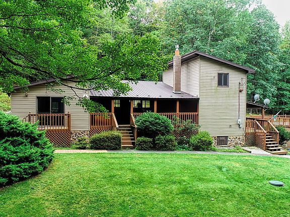 12.67 acres with 900+ feet of BORDER WITH STATE GAME COMMISSION LAND. Beautiful, private and secluded setting in Mill Creek Hollow. 3 bedrooms 1 &3/4 baths and a excellent garage. Large living room with passive solar heat through bank of windows. House has 2 bedrooms one side of the house and 2nd story suite. Efficient propane hot water baseboard heat. Large newer 2 car concrete garage has oil fha heat and electric, concrete roof is used as a patio. Large deck and porch. Driveway access to rear of home. Gas fireplace in living room. Being sold partly furnished. Lots of possibilities for recreation, near The Standing Stone Trail, Raystown Lake, Juniata River and a short drive to State College. 3 sheds, carport and atv shed.
