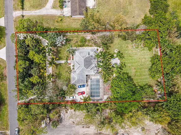 Stunning private retreat in Jupiter Farms - this one-of-a-kind estate is nestled on over an acre of serene land and boasts 4-bedrooms, 3.5-baths, a dedicated office, and a tropical backyard paradise! Featuring a thoughtfully designed layout with two primary suites, soaring vaulted ceilings, and a cozy wood-burning fireplace. The fully renovated kitchen and bathrooms shine with white quartz countertops, waterfall edges, and custom cabinetry. Step outside to your personal backyard paradise featuring a 20x40 ft sports pool, over 7 feet deep, with new screening and beautiful pebble tec finish. The expansive backyard is perfect for hosting anything from Thanksgiving dinners to sports - or even weddings! Additional highlights include a massive circular driveway, fruit trees and lush landscaping, impact windows, and paved road access, all with no HOA. Peaceful, practical, and picture-perfect, this home truly has it all.