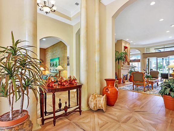 This FORMER BUILDER'S MODEL one-story, one-owner home boasts incredible upgrades, recent renovations (including a 4-year-NEW ROOF and a BRAND NEW 2022 AC system), a screened heated POOL, outdoor kitchen--all with the sublime backdrop of wide lake views (with a stunning lit fountain at night!). From the moment you open the elegant glass double doors you'll know that you're in a very special home. The builder incorporated dramatic and timeless architectural enhancements in practically every room of this renovated former model home. Soaring ceilings, adorned in layers of crown molding, stately columns and built-in mirrors create major wow-factor, complementing the new flooring in the main living areas. Installed in 2017, the wood-like porcelain tile flooring works beautifully with all the architectural enhancements to modernize the home. Gorgeous, custom, floor-to-ceiling wood wall units in the den, family room, primary suite and air-conditioned garage. The dining room is flanked by elegant columns, and impresses with a box-beam ceiling, as well as Trompe l'oeil exposed brick. The floor-to-ceiling cast stone gas fireplace is the focal point of the living room. Sliders off the living and family rooms graciously open to the screened lanai. With the backdrop of dramatic lake views, the heated pool features a soothing waterfall. Combined with the built-in outdoor grill and fully screened enclosure, the pool area is an extension of the home, and ready for relaxing, entertaining, or dining pool-side. The 20'x19 air conditioned garage brings the under air square footage to 2,575, and features crown moldings, two built-ins, and its own AC system (2015). The stainless kitchen appliances were replaced in 2020 (with warranty), and the 2022 AC has a 10-year warranty. The 2018 roof has a 10-year transferrable warranty. The pool heater was replaced in 2021. The Grande is the only community of single-family homes in Ibis which offers its residents the exclusive usage of its own community pool. The exterior of this home is scheduled to be painted in January, 2023, and the new owner can choose the color.