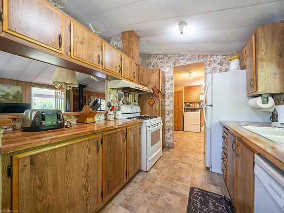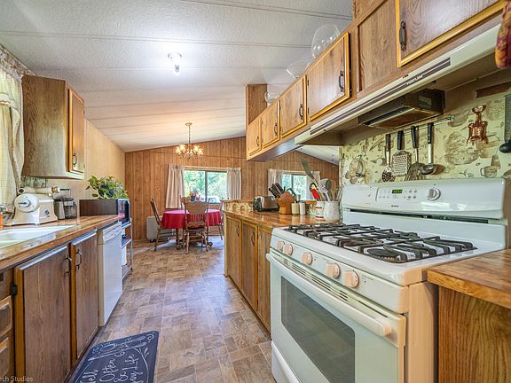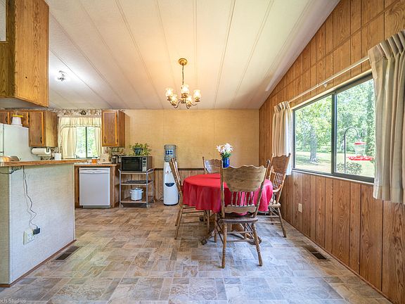 Beautiful setting,Golden West MFG Home on Permanent Foundation. 35 year roof, new 4 years ago. 2 large living areas, Large air tight wood stove easily heats whole house (or use forced air unit). Large master bedroom with bathroom, utility room with counter space, storage and pantry cabinets and door to nice back porch. All appliances included (or not) as preferred. New high quality patio cover full length of house over new porch-deck over looking back of property out to creek area. Property gently slopes down to large flat and house and then down to second flat out to creek. Underground irrigation lines allow possible irrigation from creek on most parts of property, per seller. There are a few fruit and walnut trees and a pomegranate bush. Property would make a beautiful vineyard or a nice habitat for your favorite animals, if it were fenced. Much wildlife including deer, quail, gray squirrels, turkeys and usual assortment of native birds. Huge tree shades most of the house. There is a 2 car detached garage, large RV pad 17x30, close to septic making hook ups easy to install. Also a 10x12 storage shed and lots of room for large garden and/or a new shop!