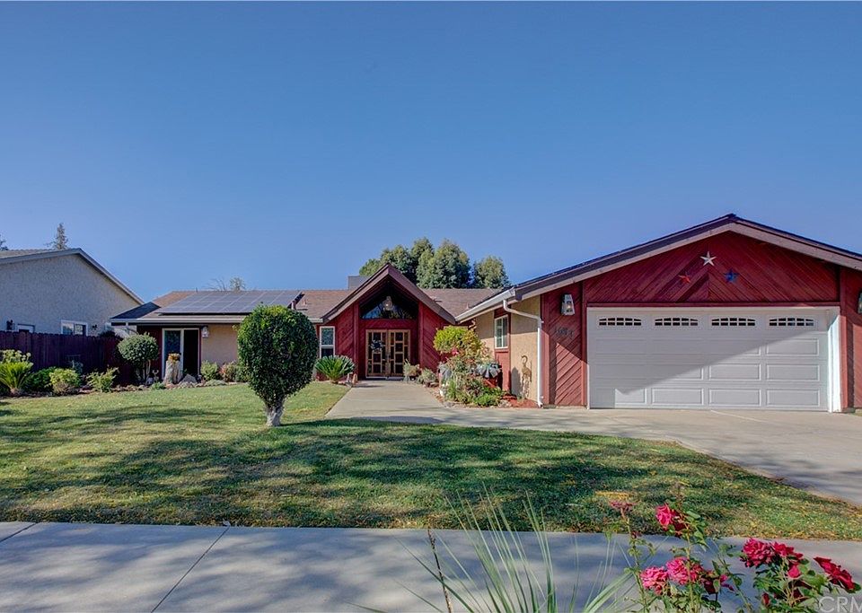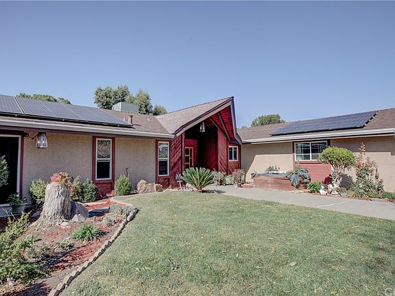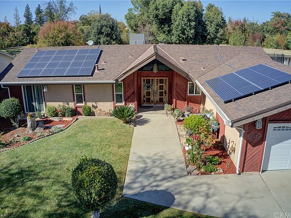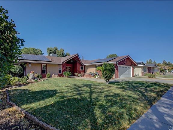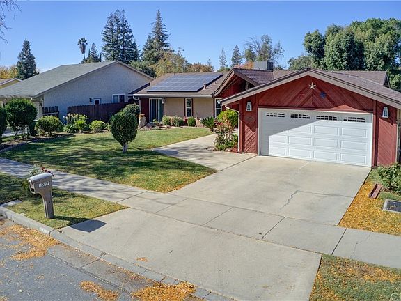 Beautiful home in a very desirable North Merced neighborhood! The home boasts 3 bedrooms, 1 full bath, 3/4 bath, and 1,794 sq. ft. of living space. Upon entering you will notice a large walkway, a double door entrance with tiled flooring, and large vaulted ceilings. A spacious floor plan with a double living room, with carpet flooring, a rock fireplace, a sliding patio door, and a nook area with real wood flooring leading to the dining room. The formal dining room is spacious and open to the kitchen. The large open kitchen offers tiled countertops, an electric stove, double sinks, a dishwasher, and plenty of cabinets throughout. All bedrooms are spacious and each room includes its own ceiling fan, sliding closets, double pane windows, and an indoor laundry room. Enjoy the oversized master bedroom that offers Mr and Mrs double closets, a sliding patio door, double sinks, and a walk-in shower. The backyard is great for entertaining with a wood deck on the side of the home, lots of yard space, large trees, a separate area perfect for gardening, and access to the park located behind the home. The home has Solar and is at a perfect location near Black Rascal Strip Park, bike paths, schools, shopping, and much more. A must-see!