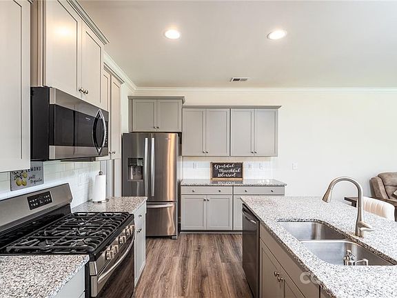 BETTER THAN NEW! This upscale townhome features an open floor plan, with luxury vinyl plank flooring throughout the main living area. A perfect chef's kitchen includes gas range, dark granite countertops, SS appliances, subway tile backsplash, pantry, and large island w/ breakfast bar. Upstairs are spacious secondary bedrooms, and laundry room. Fall in love w/ the oversized master suite with walk-in closet, along with the large seamless shower. Take advantage of upgrades not included in new construction,including the two overhead storage shelves added to garage, new W/D, blinds, & ceiling fans throughout. Maintenance free living at its best, with waste collection, exterior pest control, irrigation, and full yard landscaping included in the HOA dues. Minutes from Lake Wylie, and everything lake life has to offer. Award-Winning School District. Enjoy the many community amenities including; Outdoor pool, Clubhouse, Picnic/Grilling area, Playground, Bocce, and Pickle Ball Courts.