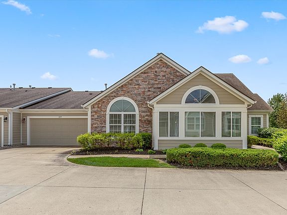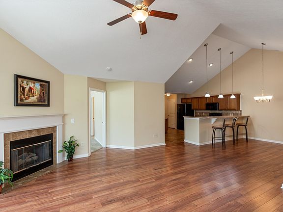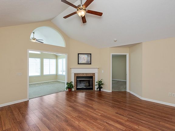 Welcome to the beautiful condo community of Villas at Timber Run! This stunning property offers the perfect blend of luxury, comfort, and convenience. As you enter the neighborhood, you'll be greeted by a beautiful entry that sets the stage for the beauty that awaits within. As you cross over the bridge, take a moment to admire the clubhouse to your right, offering a fitness center, a kitchen, a gathering spot, and an outdoor pool-perfect for relaxing and entertaining. This one-level home features vaulted ceilings in all major rooms, creating an open and airy feel throughout. The sunroom is a delightful retreat, with windows on three walls that let in an abundance of natural light and offer stunning views of the surroundings. The spacious great room is the heart of the home, boasting a cozy gas fireplace and stylish wood laminate flooring, creating a warm and inviting atmosphere. The kitchen is, complete with modern appliances including an electric range, overhead microwave, dishwasher, and refrigerator. Ample cabinet and countertop space, along with a convenient breakfast bar. Pendant lighting adds a touch of elegance, while a pantry provides additional storage space. The primary bedroom is a peaceful retreat, featuring a walk-in closet and a luxurious en-suite bathroom with a full shower stall and spacious sink base for storage. A second bath with a tub/shower combo caters to the needs of guests or family members. Completing this wonderful home is a two-car attached garage and a dedicated laundry room, complete with a front-loading washer and dryer, as well as a water softener. Don't miss the opportunity to make this beautiful property your own and experience the luxury living at the Villas at Timber Run.