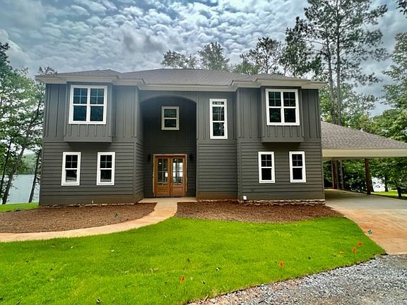 New build with spectacular lakefront views on Lake Harding and private dock, 176ft water frontage. Spacious floor plan, double wood front doors grace the front entrance of this beautiful home. Custom wood moldings throughout, two story ceilings with 8ft doors and luxury master on main. Loft area provides lake views for a reading room or office space. Bonus room is perfect for a workout space, kids’ playroom, craft, or collectors’ room. Master Suite includes walk in closet with built ins, soaking tub, separate oversized fully tiled shower with pebble stone flooring and double vanities. Cararra tile flooring in bathrooms, LVP flooring in main living and bedrooms. Kitchen features white Cararra quartz counter tops, large island with farmhouse sink, under counter mounted microwave, stainless steel appliances, gas cook top and double ovens. Double French doors leading to covered lakeview deck. Foam Insulation. Attached double carport with additional parking pad.