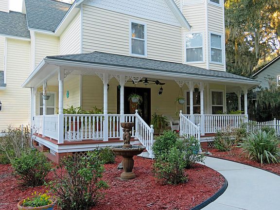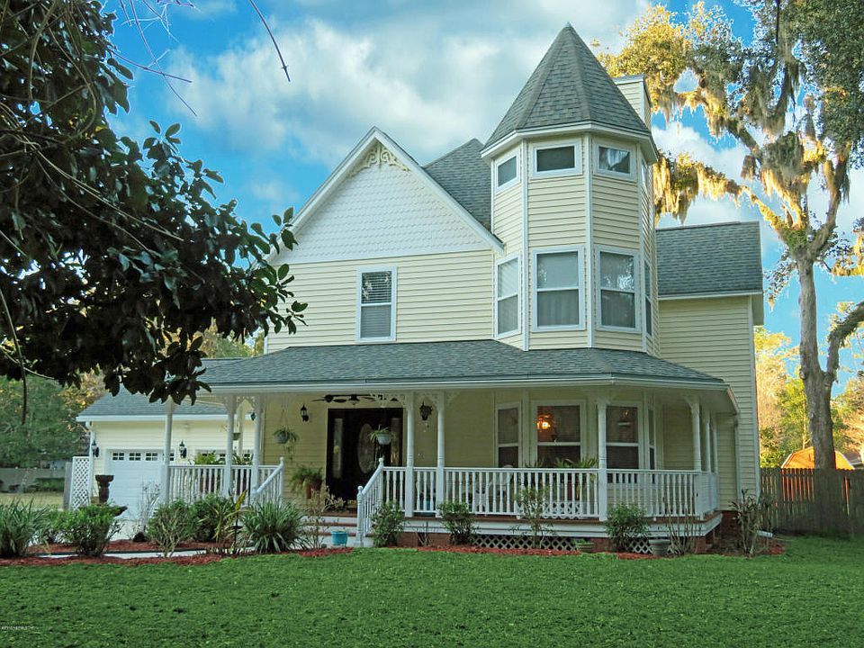 Welcome home to this wonderful custom 3 bedroom, 2 1/2 bath Victorian home with Florida/sun room on a .57 acre estate lot built in 2000 on a beautiful tree lined riverfront street in Fruit Cove. Interior features include wood floors, custom bead board, wainscoting, crown & chair rail moldings, ceramic tile, 2 fireplaces, upgraded lighting, inside laundry with washer & dryer, ceiling fans, digital thermostats, French doors, built in book shelves & entertainment center with 52'' flat screen TV, gas water heater, large walk in attic above 2nd floor, & fluted molding around doors. Kitchen has raised panel cherry cabinets with crown molding & glass front display cabinets, bay window in nook, sink with sprayer feature, crown molding, tin backsplash, ceramic tile floor & counter tops, dishwash