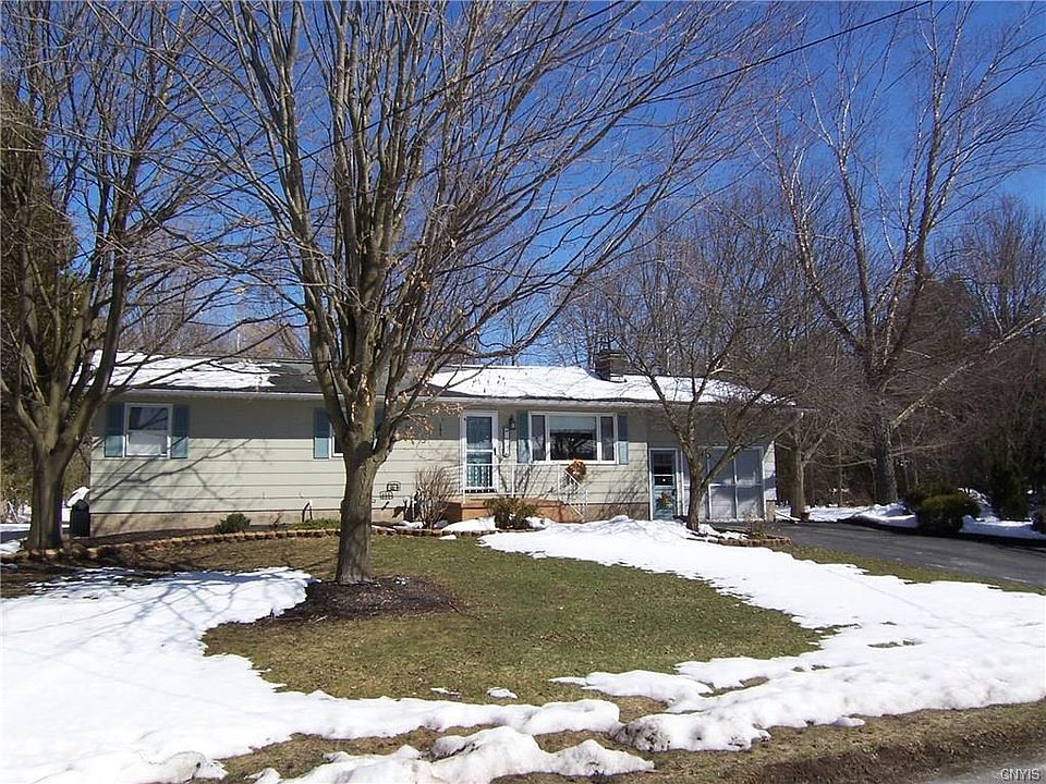 Adorable Ranch has an open floor plan! Custom kitchen with white cabinets and appliances. Large dining area with hardwood floor. Living room with hardwood floor and wood burning fireplace. Two nice size bedrooms with hardwood floors and closets. Large central hallway with walk-in closet, single closet and linen closet. Full basement - tall and dry! One car attached garage is extra deep and has screen to use as a Summer Room. Two tier rear deck and all on just under 3 acres! Newer furnace and central air too!