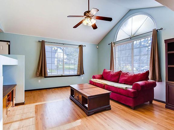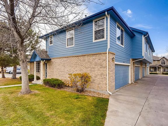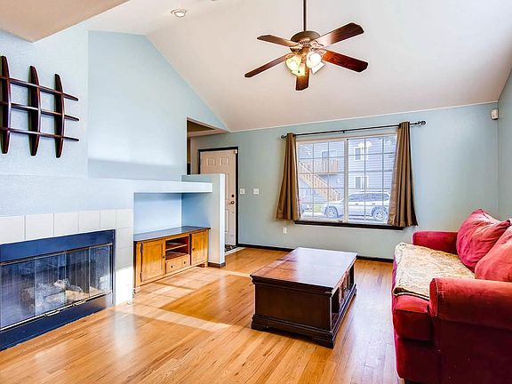 This awesome end unit features 2 large master suites with walk-in closets, ceiling fans, AND private bathrooms, an over-sized two car attached garage, excellent location, and well maintained complex! As you enter through the front, you're greeted with a nice tile entryway with a closet that leads to a large living area. The living room boats soaring vaulted ceilings, ceiling fan, built in gas fireplace, built-in entertainment center with tons of natural light! Glowing hardwood floors throughout the main and partial upper level! The cozy dining area has upgraded lighting, easy access to the kitchen, and a walk out to your personal patio! Kitchen features tile flooring, pantry/storage closet, updated lighting, lots of cabinet space, and the dishwasher, stove/range/oven and the kitchen refrigerator all stay! Guest powder room on main! Close to Wagon Road park & ride, I-25, bike trail! Community garden!