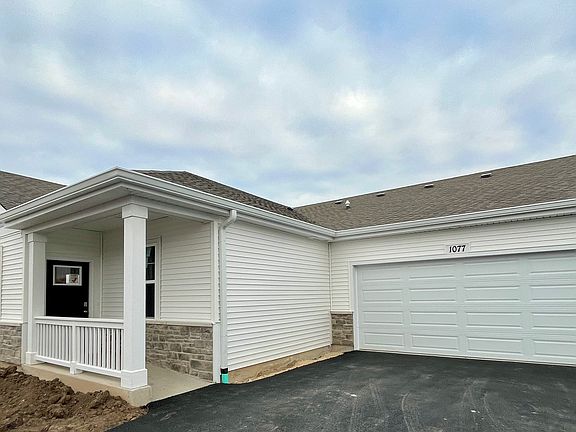 Envision yourself at 1077 Williamsburg Street in Pingree Grove, Illinois, a beautiful new home in Cambridge Lakes North. This ranch townhome is ready for an immediate move-in. Homesite is low maintenance and includes a fully sodded yard. This Callihan plan offers 1,360 square feet of living space, 2 bedrooms, 2 bathrooms, 9-foot ceilings and a 2-car garage. When you first enter the home, there is a secondary bedroom and full bath with closet space. Down the hall, you will enter the open concept great room and kitchen. The kitchen layout includes a large island with an overhang for stools, quartz counter tops with a stainless steel overmount sink, and White cabinetry. Additionally, the main floor includes easy-to-maintain luxury vinyl plank flooring and walk-in laundry room. Enjoy your private get away with your spacious primary bedroom and en suite bathroom with a raised height dual sink, quartz top vanity and walk-in seated shower. All Chicago homes include our America's Smart Home Technology, featuring a smart video doorbell, smart Honeywell thermostat, Amazon Echo pop, smart door lock, Deako smart light switches and more. Exterior photo of actual home. Interior photos are of similar home and model home. Actual home build may vary.
