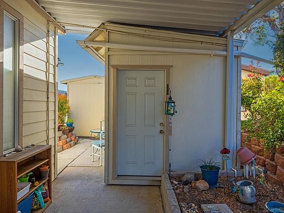 Come see this beautiful 3-bedroom Goldenwest manufactured home with stunning views, elegantly perched high on the hill in this lovely sought after senior community. The east facing sitting porch welcomes the morning sun and the evening breeze. Enter the home to a nice sized living room with vaulted ceiling, dormer window and dual paned windows with plantation shutters for daylight and privacy. The Kitchen has an eat at breakfast bar, plenty of storage, skylight and all appliances convey. Adjoining dining room with built in buffet and pony wall/pass through to the living room. Utility room with washer/dryer included. Good sized bedrooms with ceiling fans, primary bedroom has three closets, one being an 11-foot-deep walk-in closet. Master bath has a step-in shower, dual sinks, linen closet and an extra storage closet. The home also comes with matching shed, dual access stairs, back patio with succulent garden, orange tree, and central A/C, plus affordable space rent