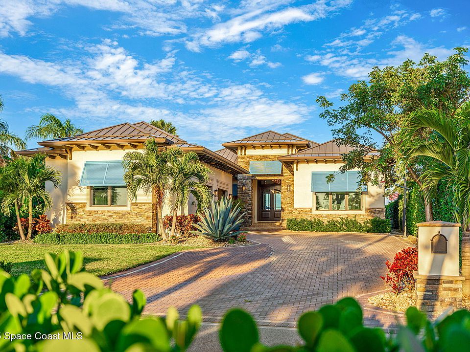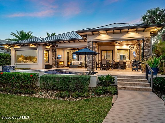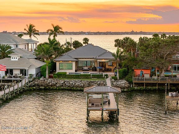 This pristine waterfront home is situated in a surreal location that features two direct riverfront shorelines capturing sunrises over the Banana River and sunsets over the Indian River. The expansive residence has impeccable finishes throughout the open concept layout with a grand living room seamlessly flowing into gourmet kitchen and bar, all with spectacular views. Your grand primary suite is its own private retreat with tasteful finishes that give a sense of serenity and zen. The resort-style pool area is surrounded by lush tropical landscaping that invites you to relax and unwind in a private oasis. With a covered lanai featuring an outdoor kitchen & fireplace creating an ideal space for entertaining while enjoying the breathtaking vistas. This is a true boater's paradise with deep water access on both riverfronts each featuring covered docks and lifts. 2022 built with impact glass, home generator, metal roof, storm screens, turn key low maintenance home in flawless condition.