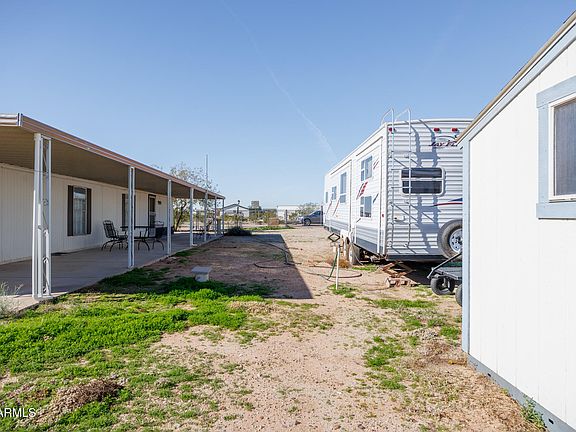 Cozy 2-bedroom mobile home on 3 lots with endless potential! Interior features include carpet in all the right places, well-sized bedrooms with sliding-door closets, and a charming kitchen with tile counters, breakfast bar, and colorful cabinets. Enjoy beautiful sunset views from the extended covered patio. The spacious backyard offers storage sheds, RV hookups, and plenty of room for your landscaping ideas. Don't miss this opportunity—make this home yours today!