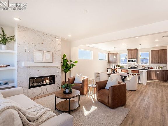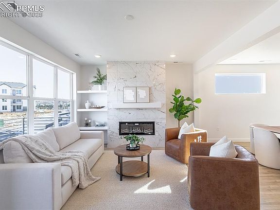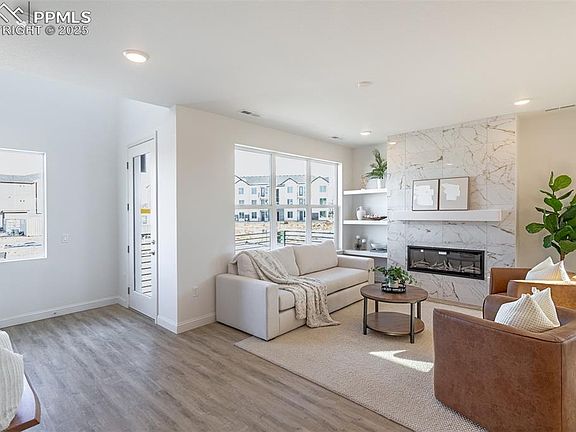 Discover one of the most private and sought-after lots in the Parkside at Victory Ridge community, where luxury and serenity come together in this exceptional Tristyn floor-plan. This stunning three-story row home offers sophisticated design, premium features, and an unbeatable location backing to open space, providing the perfect retreat for modern living. Step inside to a thoughtfully designed entry level, featuring a versatile flex space and a convenient mudroom that seamlessly blend practicality with style. Whether you need a home office, gym, or extra storage, this space adapts to your needs. On the main level, elegance takes center stage. A grand two-story foyer welcomes you into the expansive great room, which flows effortlessly onto a private deck, offering a seamless indoor-outdoor living experience. The kitchen is a culinary dream, boasting a spacious island, cozy dining area, and an oversized walk-in pantry, making it perfect for entertaining or everyday living. The upper level is dedicated to rest and relaxation. Two spacious secondary bedrooms share a full hall bathroom, while the convenient laundry room simplifies daily chores. The luxurious primary suite is a true sanctuary, featuring a roomy walk-in closet and a spa-like bathroom with dual vanities, offering the perfect place to unwind. With its premium lot backing to open space, high-end features, and a location that combines convenience and tranquility, the Tristyn floorplan is a rare find in Colorado Springs. Schedule a tour today and experience the perfect balance of luxury and privacy at Parkside at Victory Ridge.