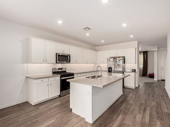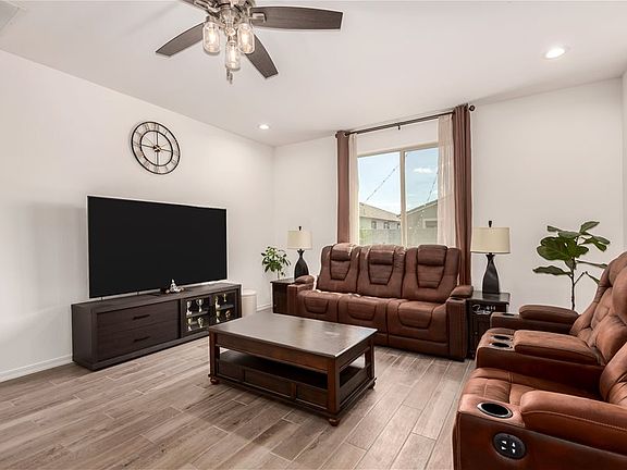 Move-in ready home w/all appliances, solar, water softener, & R.O.! The first floor offers a private guest suite with its own bathroom and walk-in closet, plus a versatile flex room ideal for a home office, game room, or sitting area. Beautiful wood-look tile plank flooring extends throughout the main level. Upstairs, you’ll find a spacious loft, the owner’s suite, and two additional bedrooms. The modern kitchen features stainless steel appliances, a gas range, and a large island with Great Room & Loft! Elegant creamy white cabinetry pairs beautifully with upgraded quartz countertops and matching wood-look tile floors. **Community Pool with biking, walking path, playground, & more. Synthetic Grass in backyard!