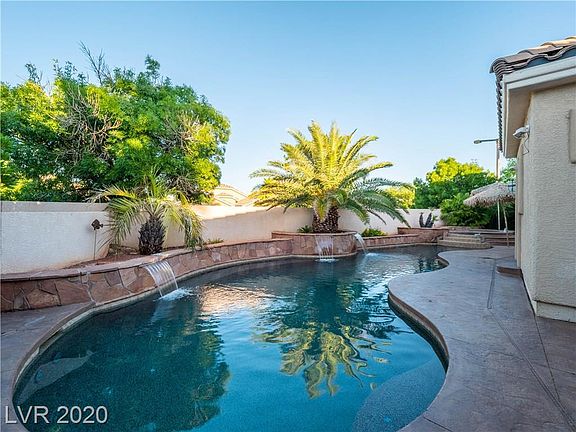 Rare find! Summerlin single story pool home situated on a raised corner lot. This lot boasts mature landscape, garnering owner optimal privacy, massive rear grass lawn with added dog run and Sparkling Pool and Spa with LED color changing lights for those hot summer nights. Home Theater with Epson High Def Projector has double doors which open to the backyard allowing you to watch a movie or a game right from Jacuzzi. Home Theater is located off the great room and all built in equipment conveys with property. Expansive Master Suite is separate from other three bedrooms. Separate Office with glass french doors, vaulted ceiling and sky light located off the great room for a functional at home work space. Additional features to include: Plantation shutters, Vaulted Ceilings, Upgraded Wood Laminate Flooring, Granite Counters, Stainless Steel Appliances, Finished Garage with Epoxy Floors,and Stunning Focal Point Gas Fireplace bringing a warm feel to the home. Bring your most discerned Buyer