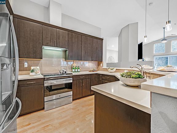This completely remodeled 2 bedroom condo offers the perfect blend of premium living and serene tranquility. With the living space on one level, the open floor plan connects the kitchen with counter top seating, to the main living space and added loft area. This area off the family room is ideal for use as an office or play space. The kitchen is a culinary masterpiece, featuring quartz counters, designer tile, and stainless-steel appliances, all illuminated by chic pendant lighting. Modern cabinets offer ample storage, completing this contemporary culinary haven. Maple hardwood floors flow throughout, complemented by carpet in the bedrooms. Both baths have been completely remodeled, boasting quartz counters, a luxurious soaking tub, and a modern glass shower door. The 2nd bedroom is equipped with a convenient built-in Murphy bed and desk, maximizing space and functionality. Every detail has been carefully curated, from the upgraded lights and faucets to the modern, linear gas fireplace, creating an ambiance of sophistication and warmth. Step outside to your spacious and fairly private deck, where you can relax and unwind amidst gorgeous trees and hills. With a 2-car attached garage and laundry area, this home has it all. Minutes away from 580/680, BART, top schools and downtown.