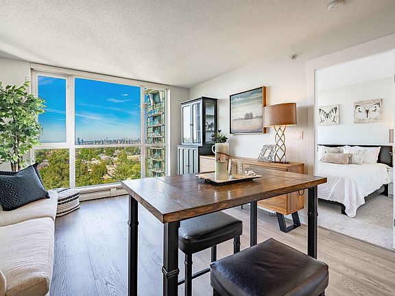 City Point! You will love this unit! This is a beautifully updated 1 bedroom plus a den condo, spacious 551 sq.ft, Quiet side of the building with amazing park, mountain and city views. Baseboard hot water heating included in the strata fee! The unit features new carpet, new laminate floor, new microwave and newer painting! In suite laundry, BBQ allowed on the balcony, Super convenient location, Gateway Skytrain just cross the street, Short distance to University Campus, Shopping Centers, etc. 1 parking and 1 big storage. 1 cat, no dog allowed. Owner occupied and shows great! Openhouse Oct 12 Sunday 2-4pm.