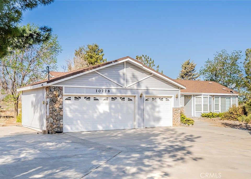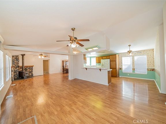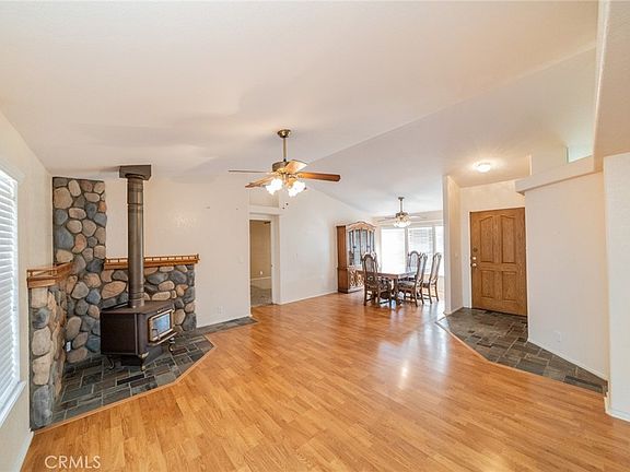 Enjoy the open feeling in this upgraded home with laminate flooring, tile countertops formal dining area, and a wood stove to keep you warm Sitting area to enjoy the sunrises and covered patio to enjoy the sunsets. Kitchen is loaded with storage. Home also has good sized linen closet, storage in laundry room, large bedroom closets and walk-in closet in master And this one has an attached oversized 3 car garage with Large cement parking area. On 1.9 acre fenced corner lot, just 1/2 mile from paved road. Award winning Serrano School District. Great horse property, all flat and useable. Several equestrian groups in the area offering shows, barrel racing, gymkhana, team penning and great area for trail riding. 2 adjacent lots also available
