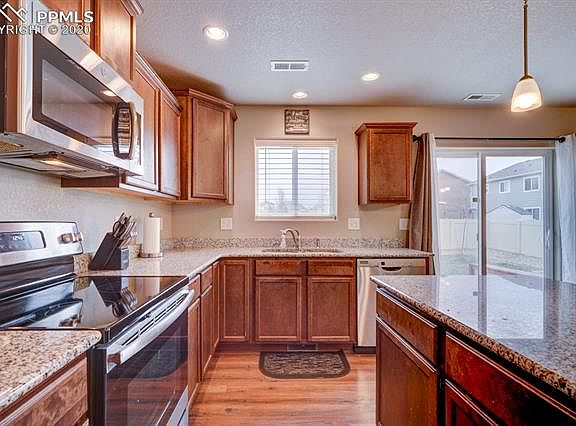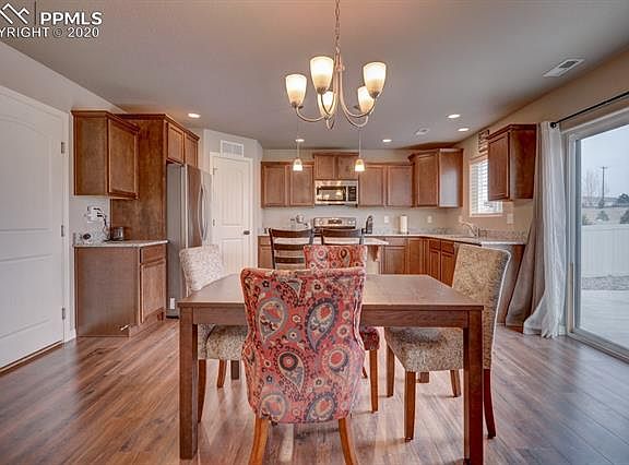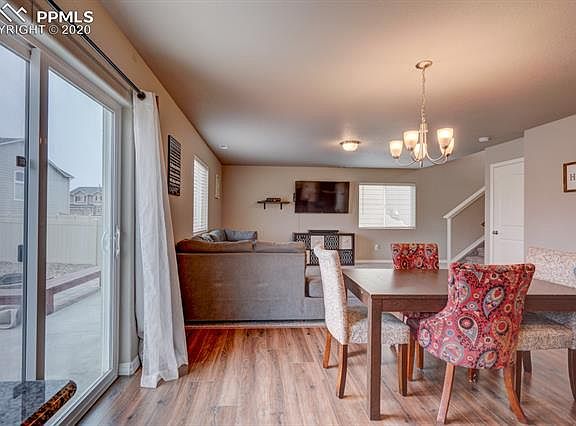 WELCOME HOME to beautifully maintained 2018 home in desirable Ventana Subdivision! Main level has a bright and open floor plan, the living room opens to dining and kitchen area that features all stainless steel appliances, granite countertops, island counter bar, plenty of cabinet and counter space with a pantry for all the extras and walks out to extra large patio overlooking fenced backyard that backs to trails/open community area. Upstairs you will relax is large master bedroom with area that can be used as nursery/sitting/office area, an adjoined bath and walk in closet, there are 2 additional bedrooms, a full bath and laundry area. This home backs up to trails and open community space. Follow these trails throughout the neighborhood to a parks/playgrounds, apple orchard and the clubhouse with gym and outdoor pool. You are conveniently located to Fort Carson, schools, parks, shopping, restaurants and just minutes from I-25. Don't miss this gem it will not last long, call for your private showing today!