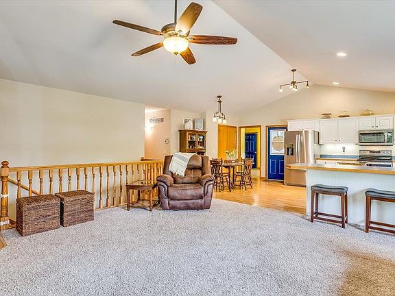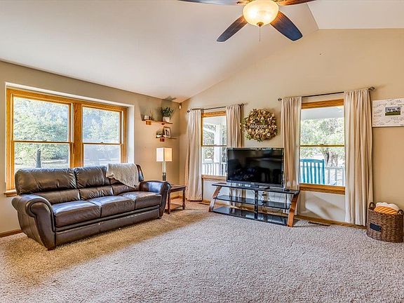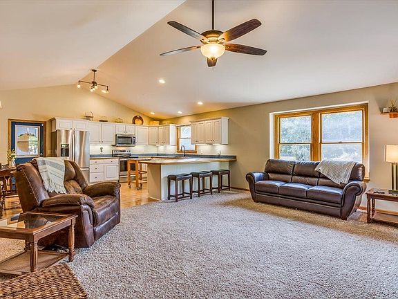 Welcome home! The perfect combination of a fabulous home on 3.69 acres, an impressive 50’ X 40’ outbuilding with an awesome Man Cave/She-Shed area, and located in a quiet country setting, with gorgeous sunrises and sunsets to enjoy! The private drive is welcoming with the perfect covered porch front entry. Anderson windows throughout the home provide abundant natural sunlight and offer beautiful views of this great setting. The main floor features a vaulted ceiling in the open living, dining and kitchen area, creating a wonderful family living space. The well-designed kitchen has terrific cabinet and counterspace, an oversized eating bar – great for gathering in the kitchen and cooking a feast! The kitchen also includes a pantry and newer appliances just purchased in 2023 - refrigerator, range/oven, dishwasher and microwave! The kitchen is open to the spacious dining area and includes an exterior door to the covered back porch area - the perfect layout for grilling! Just off the kitchen and garage is an awesome laundry room with great space and the newer washer and dryer (2022), a cubby area, wash sink and half-bathroom - making this area a great landing area coming in from the outside or garage. The main floor also includes the primary bedroom suite with a large bedroom and bathroom, including a double-sink vanity, large linen/storage, and an oversized walk-in shower – and more windows with more great natural light! There and two additional bedrooms with a nearby second bathroom with a tub/shower. The full daylight basement features a large family room with great indirect lighting – perfect for movie night! Additional basement finished rooms include a great recreation/game or toy area off the family room – which could also be used for a home gym area, or even additional space for an office or study room. There are two more finished bedrooms with great closet space, and a full bathroom with tub/shower, and a large unfinished room that could be another office area. The impressive outbuilding has incredible space and so many possible uses! There is a fantastic, finished Man Cave/She-Shed area (25’3” X 15’5”) that includes AC with space for office furniture or just casual relaxation furnishings, sink and faucet with lower cabinets, media connections, and a full bathroom with a walk-in shower! You really need to see the outbuilding to appreciate the incredible space! There is even a playhouse/playset under the trees for the fun fall evenings that are coming! This property provides a unique opportunity to live in a great location with an awesome house, fantastic outbuilding, acreage, and an incredible setting to enjoy with family and friends!