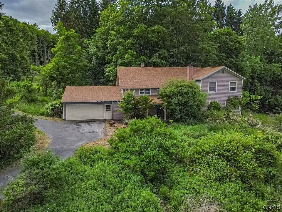 Unique 5 bedroom home nestled between Skaneateles and Otisco Lakes on 19+ acres, with 10 stall horse barn with metal roof, vintage one room cabin, fruit trees, blueberry bushes, and a private pond complete with dock in the Marcellus school district. The 3000 + sq ft farmhouse features lovely hardwoods throughout the 2 levels of spacious living. The first floor features a sunny living room w/ gas fireplace, formal dining room, large country kitchen with access to a private screened-in porch, walk-in pantry, expansive office / den, 1st floor bedroom and full bath with laundry. The second story offers 4 bedrooms, each with large closets, an updated full hall bath, and "Jack and Jill" half bath. There have been recent updates including: new septic (2022), exterior painting, and furnace (2019). The current condition of the property does require some TLC, but for the right buyer, this is the perfect opportunity to bring a really special property back to life and then enjoy a private estate. Buyers should not walk the property without an agent.