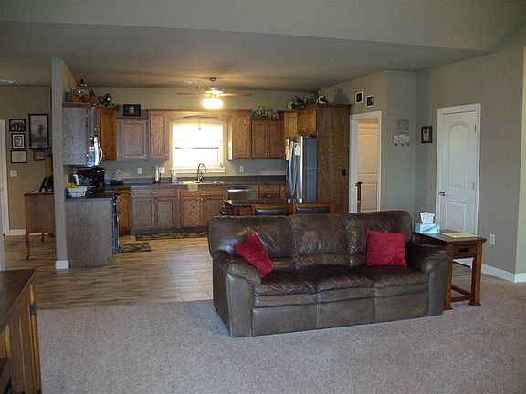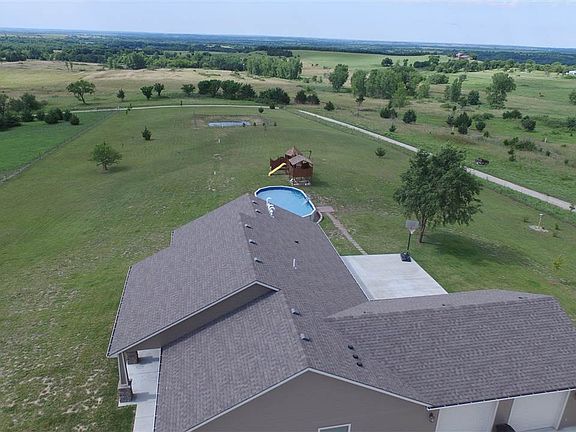 Spacious, one level home built in 2014. Incredible views over the rolling hills in three directions. Large rooms, split bedrooms with master suite to the north with master bath, tile shower, spa tub and large walk-in closet that serves as the safe room. Living room flows into the kitchen. Room for eat in area in kitchen and separate dining room to the south. To the south side of the house are three good sized bedrooms, large full bath and utility closet. Under floor electric heat through the house plus forced air and heat. R23 foam insulation in the walls and R36 spray foam insulation in the ceilings. Mud room is just off kitchen on way to a large oversized garage. Large patio area, pool, and play area to the south. Outside also is a two car garage with extra shop area. Part of the acreage is fenced for horses. Smooth wire fence and a three stall horse barn with tack area.