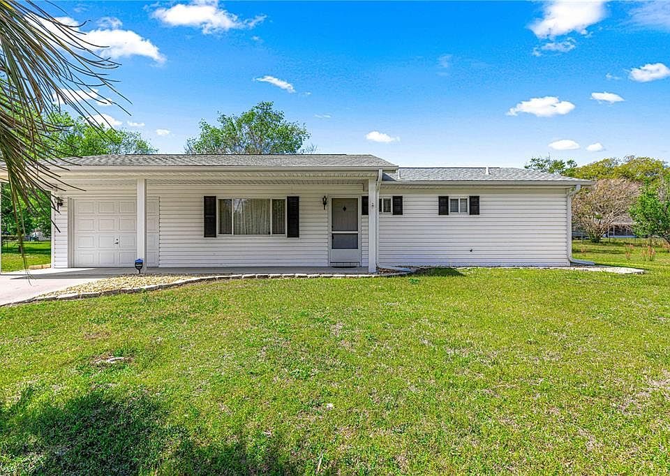 Welcome to easy, carefree living in the Spruce Creek Active 55+ Community. This immaculate, light-filled 2-bedroom, 2-bath home showcases luxury vinyl plank flooring, stainless steel appliances, and freshly painted interiors for a crisp, inviting feel. The comfortable layout features a spacious primary suite with a large walk-in closet and an en-suite bath with a tub/shower combination. A generously sized secondary bedroom offers easy access to the guest bath with a walk-in tile shower. Recent updates include a roof replaced in 2021 and an HVAC system upgraded in 2020. Enjoy the Florida lifestyle with an enclosed lanai, covered front porch, ceiling fans throughout, and a garage with a durable epoxy-coated floor. A convenient parking pad provides easy turnaround and added ease when entering or exiting the property. Low HOA fees include trash service and security patrol, while community amenities offer a clubhouse, swimming pool, fitness center, library, billiards, and a full calendar of year-round social activities. Conveniently located near shopping, dining, medical facilities, and major roadways. Move-in ready, well maintained, and affordably priced—schedule your showing today.
