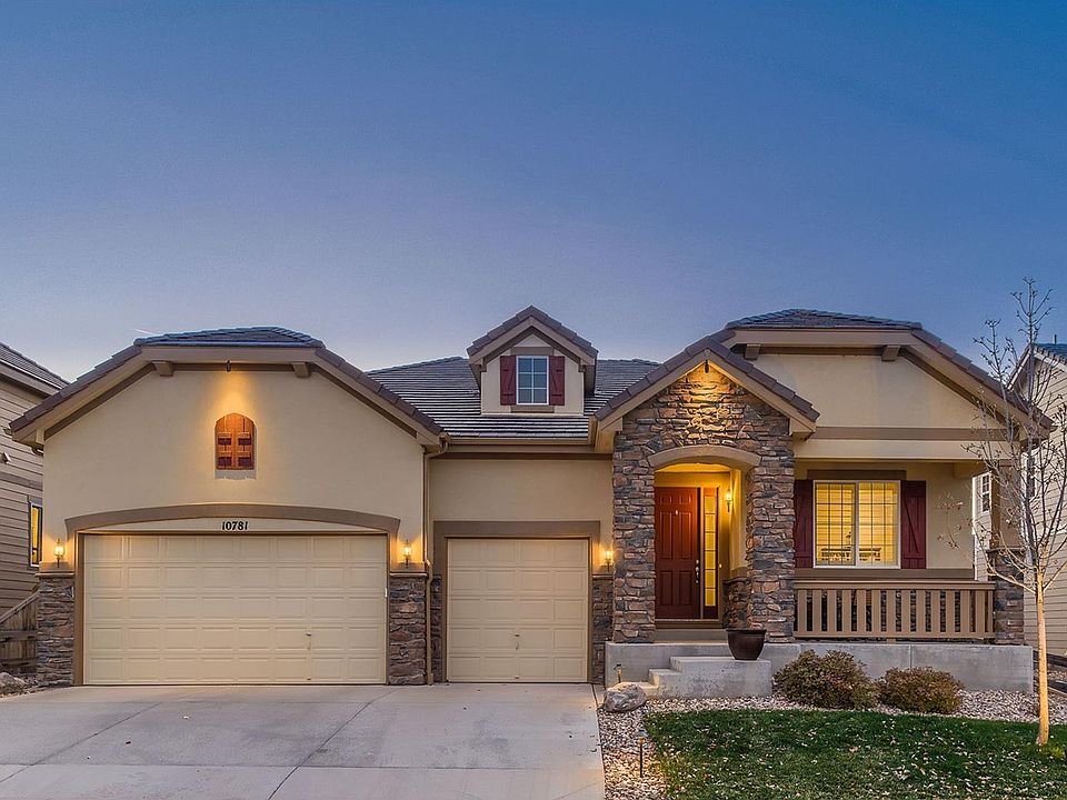 Warm & inviting 4 bedroom home with study & 3.5 baths. 2013 Richmond built home located in popular Meridian Village and Douglas County School District. Situated just east of Lone Tree, only 3 miles from I-25 and Lincoln St. Light Rail station, commute into the DTC and Downtown is a breeze. RANCH floor plan with huge bonus room in finished basement, 3 car garage, and low-maintenance backyard with fire pit. Chef's dream kitchen with large granite island, pantry, stainless steel appliances, and gas range. Full master bedroom with en-suite bath. Community pool, central park, and trail system.