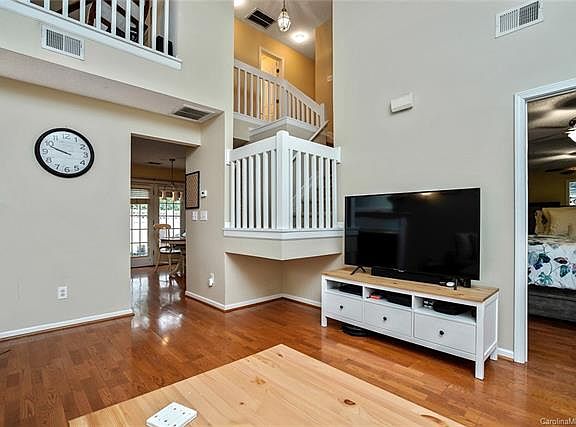 Super cute end unit with master down in great neighborhood with mature trees. Granite and stainless appliances in kitchen. Fireplace in vaulted family room. Fenced back patio area with new sod. Great outdoor living space! Upstairs features bedroom, full bath and loft that overlooks family room. Great natural light throughout home! Convenient location close to Northlake Mall shopping, restaurants, I 485 & 1-77. Community features a pool for those hot summer days.