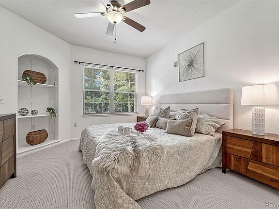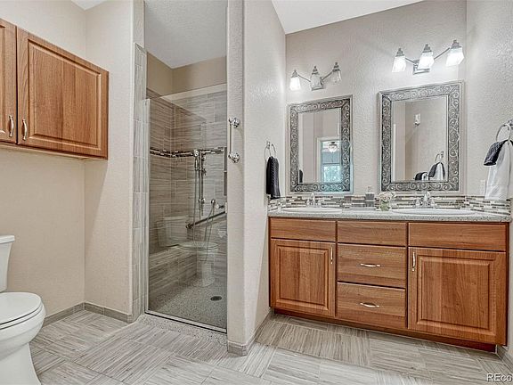Backing to the Cherry Creek Trail, this beautifully remodeled, ground level condo checks all the boxes! This sun-filled 2 bedroom, 2 bathroom home has a spacious primary suite with gorgeous tree views and a large walk-in closet. Its ensuite bathroom boasts $20k in updates, including silestone counters, and a custom zero entry walk in shower with a bench seat and frameless glass door! The large second bedroom has west views of the greenspace and trail. Its full bath has tile countertops and tile floors. The kitchen features newer quality appliances, stunning granite countertops, and a walk-in pantry! The laundry is conveniently located with a full size side-by-side washer & dryer, both included. Other updates include the hot water heater 2021, and brand new carpet and paint throughout. The open floor plan provides a flow from kitchen to dining, and the living room invites you to cozy up and stay awhile with its warm fireplace and light filled windows that overlook the quiet scenery of trees and the trail beyond. From the living room you enter out to the covered patio, perfect for morning tea or wine at sunset. This condo has quick access to the trails, the outdoor pool, fitness center and hot tub. Don't miss out on this location! With ample storage and a detached garage (#53) with opener. Just minutes to everything you need, Downtown Parker's Main Street restaurants, retail shops and O'Brien Park. Smoke free and pet free.