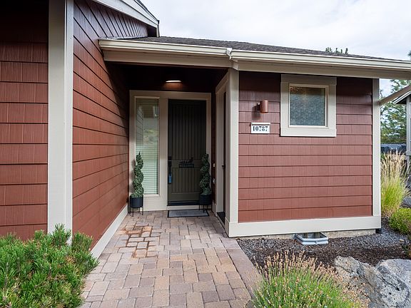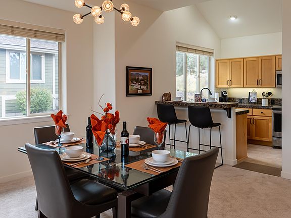 Highly upgraded single level end unit Creekside Village townhome with amazing privacy and an elevated view of the neighborhood and surrounding terrain. Upon entering the foyer, you are greeted by a light and bright great room layout with abundant windows, new carpet, fresh paint, and nicely styled entertainment area with integrated propane fireplace. The kitchen has granite counters and new high-end stainless appliances. Vaulted ceilings frame a huge wall of windows and sliding glass door that lead to the expansive paver patio with wiring for a hot tub, storage, and access directly to the primary bedroom. The primary suite fits a king bed with comfort and has an updated double vanity, soaker tub, shower, enclosed toilet, and a closet with new washer/dryer. Up front there's a large guest bedroom with adjacent full bath that functions as a guest ensuite. This is by far the best value available in Eagle Crest and won't last long!