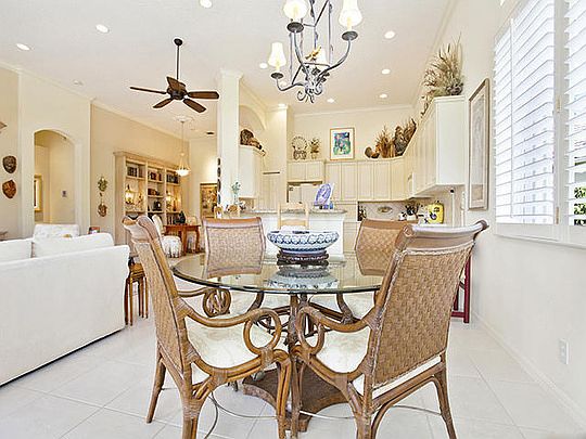 This unique, stunning home at 10788 Grande Boulevard in The Grande at Ibis Golf & Country Club sits on a pie-shaped lot with ample space between neighboring homes. When you enter the home, your eyes are drawn to the view beyond the great room to the beautiful, screened pool with the mermaid statue and the enticing water view behind it. The extended patio surrounding the pool is comfortable for sunning and dining. Outside the screened area is a garden designed with bougainvillaea and cactus plants. Back inside the house, the volume ceilings with crown molding throughout are just one of the fine features of this home. As you approach the great room, there is a game table area with stunning built-in bookcases. Opposite this area is a decorative mural in a recessed nook. Beyond this is