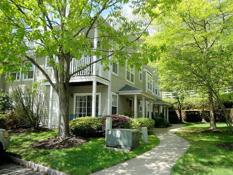 End unit with one floor living quiet, peaceful location. Spacious open floor plan has living room and dining room with sliders to private covered patio. Expansive master bedroom, walk-in closets and bath access. Sunny guest room has ample closets/storage. Modern kitchen includes all appliances, and washer/dryer closet. New hotwater heater and carpeting, freshly painted rooms & some hardwood floors. This is a move in property. Enjoy a wonderful quality of life at Paddington Square. Beautiful community pool, club house and children's play area. Convenient NYC bus transportation, trains, shopping, dining. Low taxes and excellent schools makes this a fantastic place to live. Furnishing available for purchase. Parking space 56. See it today.