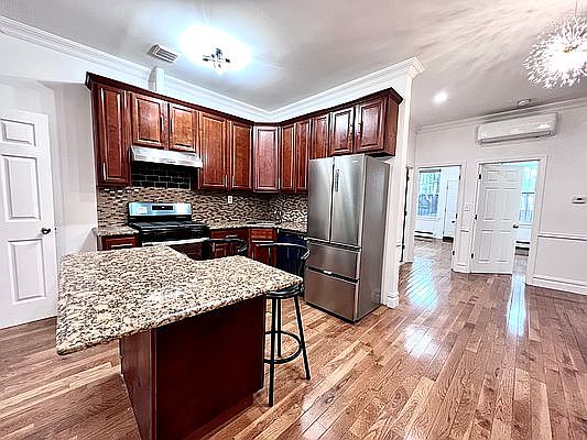 Prime Bushwick recently renovated beautiful duplex First floor 10ft ceiling three bedrooms and one full bathroom 1050 sf Garden floor 9ft ceiling open space 1000sf a full bathroom great for working from home or entertaining Plus a huge 640sf beautiful backyard Open concept bright and very roomy Hardwood floors, high ceilings, 3 large size bedrooms with deep closets Newly renovated kitchen with new stainless steel appliances washer/dryer in unit Central AC One block to Halsey J & Z train station Pet friendly Guarantors welcome