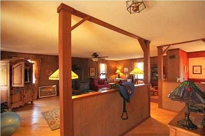 This home is situated on roughly 15 acres with a two stall barn plus garage & hay loft, training pen, fenced horse pasture, as well as another pasture. The home has hardwood floors, tile in the master bathroom, open den, dining room, and kitchen area. Upstairs there are two bedrooms sharing a nice size bathroom and a large rec room with some storage space. There is a laundry/utility room that leads to a screened in porch so that you can sit overlooking the property and the sounds of nature. There is a large basement that is great for storage plus a 2 car garage.