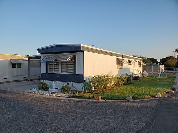 WHAT A BEAUTY! 55+ park. Beautifully and tastefully upgraded mobile home, in-town and close to everything! 1978 14’x 64’ (896 sf), 2 bd 1 bath, new kitchen cabinets, backsplash, and granite countertops. Step-in tiled shower, all electric, includes frig, stove, micro, dishwasher, disposal, washer and dryer. Best lot in park, corner lot, on grass and greenbelt, shrubs. Huge, covered carport and private fenced-in patio area with very nice patio furniture. Large storage shed. Great park and neighbors. Lot rent $310 mo! (Includes cable, water, garbage, and sewer.) Sold as-is, fully furnished with upscale furnishings. Del Valle Mobile Home Park lot #22. For a private showing, please call or text Wanda (928) 750-3934. (Posting for neighbor, if interested contact Wanda directly.)