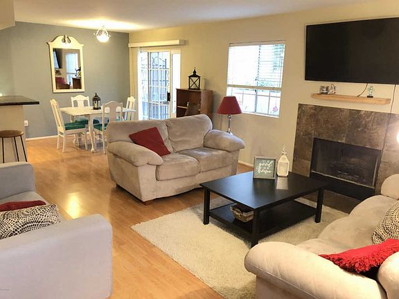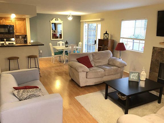 End unit with no neighbor above. Smooth ceilings, Recessed lighting, Updated kitchen: granite counters, beautiful cabinetry, gas range, walk in pantry, wood laminate flooring. Updated fireplace, newer carpet and neutral paint. 2 master bedrooms upstairs with en suite remodeled bathrooms, Laundry closet upstairs - full size laundry. W/D included without warranty or maintenance. Gated patio. No smoking. 1 car garage plus 1 assigned parking space. Call to see this lovely home today!