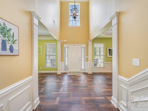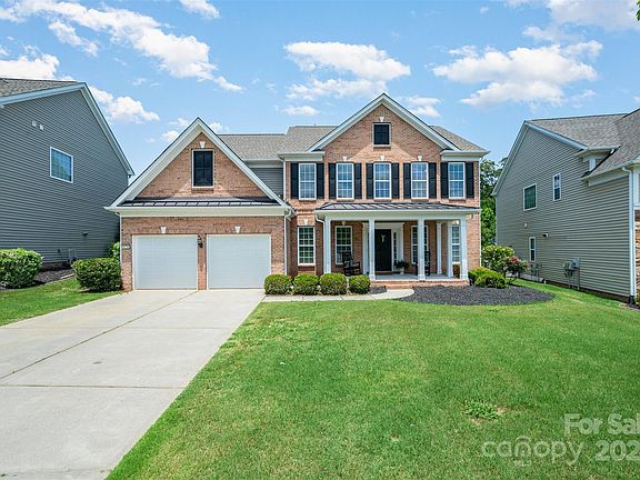 Beautiful move-in ready 5BR/3BA in highly sought after Villages at Skybrook North! Main level guest room with ensuite bath. Outdoor living spaces galore! Large, private lot backing to woods and creek with huge custom flagstone patio. Covered "rocking chair" front porch. All new LVP floors throughout 1st floor. Large cherry kitchen w/island, granite, stainless steel appliances, gas range, microwave, tile backsplash, desk & walk-in pantry. Perfect for entertaining! FR w/gas fireplace. Formal living room could be used as a study. Formal dining w/butlers pantry, tray ceiling & wainscoting. Upper level suite primary suite w/coffee bar, tray ceiling, his/hers walk-in closets, oversized shower & tub, dual vanities & tile floors. Two-story foyer. Main level laundry. Bonus room. New roof! Tons of storage. Faces WEST! Cox Mill High School! Must see!