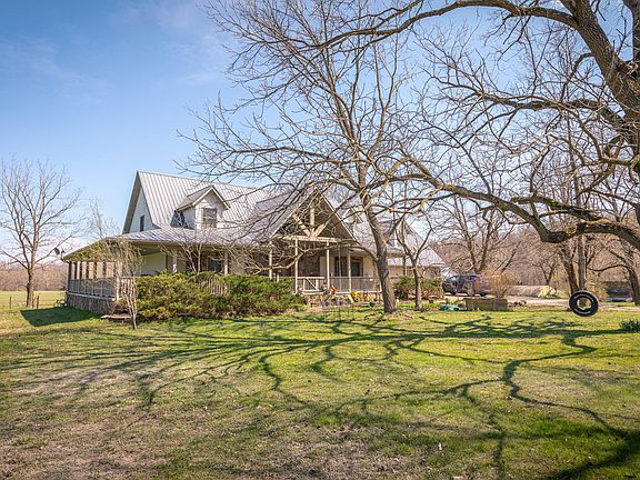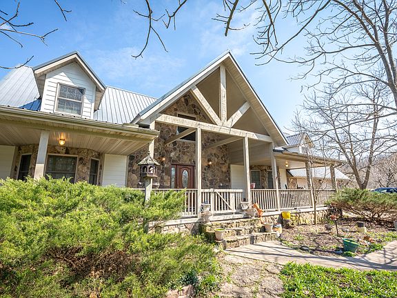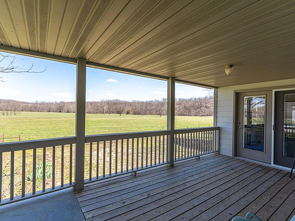 6,000 + sq ft 6 bed 5 bath w/attached garage and wrap around porch full finished walkout basement with additional kitchen, living area, and safe room. Hardwood and tile floors. Custom stonework inside and out. Beautiful Georgia pine car siding woodwork throughout the home. Sunroom and back porch overlooking 97 M/L acres of tillable bottom ground, and year round spring fed Elk Creek. Across the creek you will find the majority of the acreage. This property is a fantastic cattle combination/hunting property with plenty of food plot areas and white oak timber, it's no coincidence that this property provides some of the finest Whitetail deer, and turkey hunting that Missouri has to offer. Beautiful views plenty of barns/storage buildings.