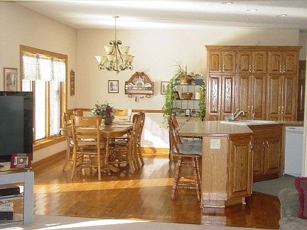 #388901.5 story home with 3,475 sq. ft. Home has 4 bedrooms & 4 baths on 20 acres, 2 miles from Cameron city limits. Main floor includes a great room-kitchen combo - open concept with large eat in area - snack bar for 10 people, large cabinet pantry and pantry closet off kitchen. Hardwood floors with transition inlays of various hardwood to living room. Upstairs includes 2 large bedrooms with walkin closets and full bath. Finished walkout basement has a family room with bar area, full bath and 3rd car garage. Stocked 3 acre lake can be view from the 34x24 deck off main floor and patio off basement. Lake is 20' deep and stocked with walleye, bass, crappie & bluegill. Very scenic and well located. Garden ares with piped water and above ground 27x52 pool. $389000