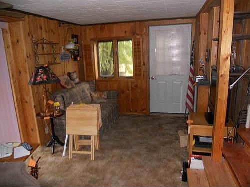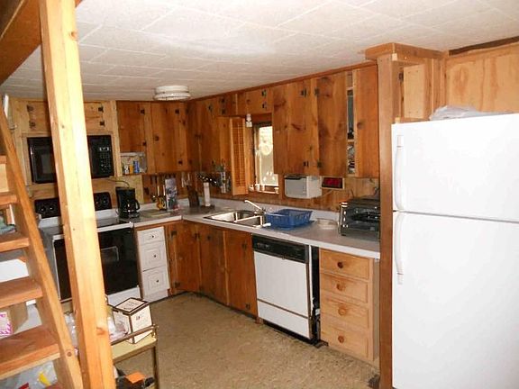 This uniquely designed 2 bedroom, 2 bath year-round home offers a spacious front deck, covered entry, free standing fireplace, knotty pine interior, an updated furnace & septic system and numerous outbuildings.
