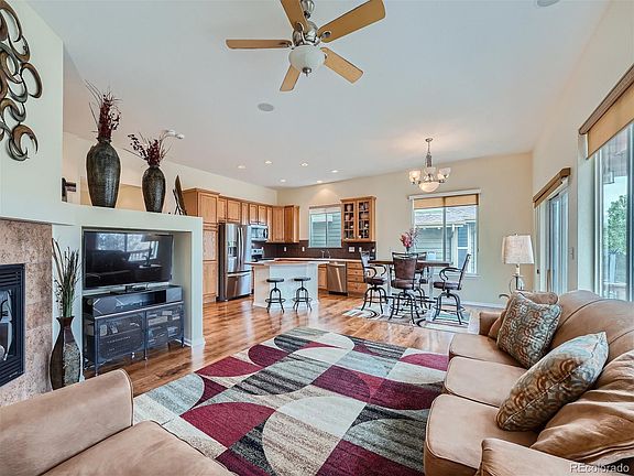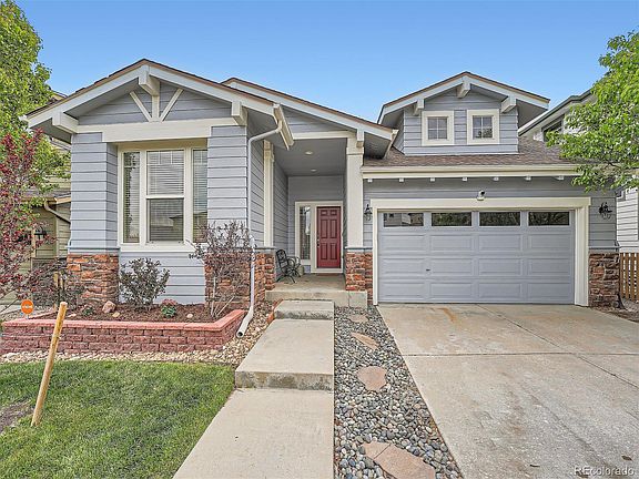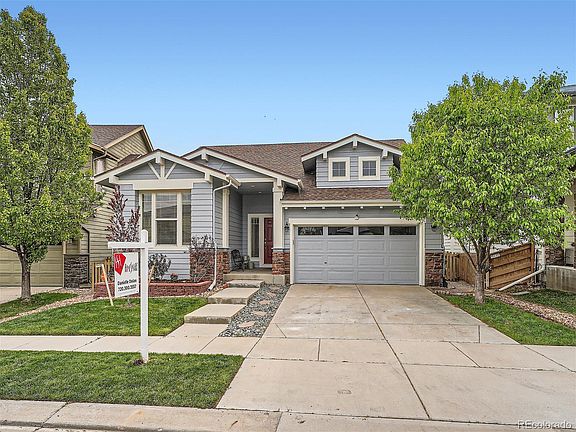 Welcome to this beautifully crafted turn-key ranch home boasting 3 bedrooms, 2 bathrooms. Upon entry, you’ll be welcomed by the high ceilings and gorgeous laminate flooring. The open concept kitchen, dining room, and living room exude style & sophistication with curated spaces yet seamless connectivity. The kitchen features an abundance of cabinetry, stainless steel appliance,s and a gourmet island, while the living room is spacious and grounded by a cozy gas fireplace. Retreat to the grand primary owner's suite to find a luxurious sanctuary, with a 5-piece ensuite bathroom including a jacuzzi tub, dual sink vanity with chic mirrors and gorgeous granite countertops, new shower door, and large walk-in closet. Two additional, well-appointed bedrooms share a main floor bath, while a chic barn door leads to the laundry/mudroom off the 2-car garage. The sprawling unfinished basement offers endless possibilities for customization. Step outside to the backyard to enjoy the expansive trex deck with a newly stained and sealed pergola, perfect for entertaining & enjoying the CO outdoors. Updates are plentiful, including new exterior and interior paint, modern lighting fixtures, Hunter Douglas blinds, updated mirrors and granite countertops, and a newer tankless water heater, furnace, and A/C. The Reunion neighborhood amenities are a highlight, with a clubhouse including a fitness center, yoga studio, pond, playground, trails outdoor pool, and a charming coffee shop just around the corner. To top it off, this home is conveniently located near E-470, DIA, and the Buffalo Run golf course. Come see this home, offering a blend of style, comfort, and convenience.