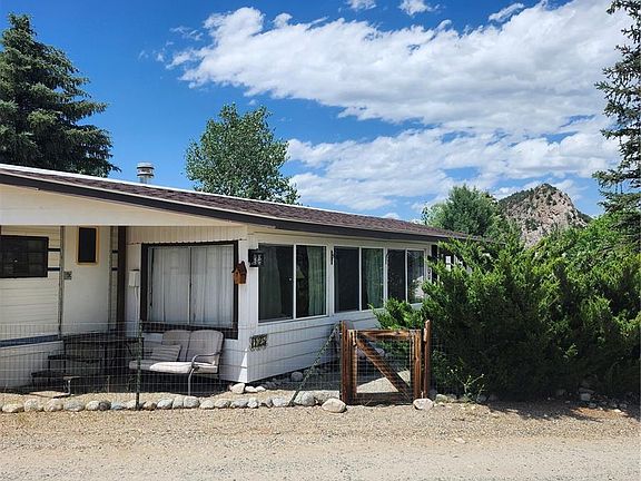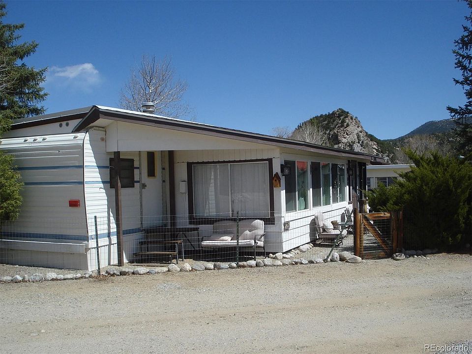 Hidden behind a huge juniper bush fence line, Pines and Aspens is a home that feels like you are surrounded by a secret garden. Fully fenced with gated access from North Dakota road or off of alley lot parking. Follow pathways through native seasonal flowers and rock accent borders leading to home or shed. Past the nook outdoor dining area among the Aspens, private and lush. The screened in covered front porch (80 sq ft) is a welcome place to relax on the comfortable patio and lounge, bug free, listening to the birds. It lends seclusion to the attached sunroom (180 sq ft) with south facing picture windows. Juniper bush fence line makes it a private view. The home comes fully furnished with unique antique style pieces. From the bonus sunroom enter the 1983 Mayflower living room open dining/ kitchen. Oak wood floors and custom aztec style rug in the living room with deep slide out seating area and vaulted ceiling. Horseshoe style kitchen with lots of counter space and full windows facing the yard and alley. Upgraded black slate tile floors in the full bathroom which separates living from bed room. Slide out queen size bed space, dresser, washer/dryer combo, and full wall length closet with lots of light from windows on either side. On warm days open the back door off of the bedroom and enjoy the breeze and privacy. The 144 sq ft shed has 2 windows and ample space for all weather storage. There is also an extra metal shed off the alley for over flow needs. Own your .06 acres in the Chateau Chaparral where you can live year round and have access to Brown's Canyon National Monument trails, Arkansas river access and epic 70's chalet clubhouse amenities. Half way between the towns of Buena Vista and Salida and countless dining, shopping and entertainment options and surrounded by hot springs, rock climbing, rafting, biking, fishing, hiking, 4 wheeling and skiing . This area is the heart of Colorado and a great spot to find adventure and community.