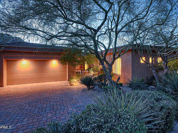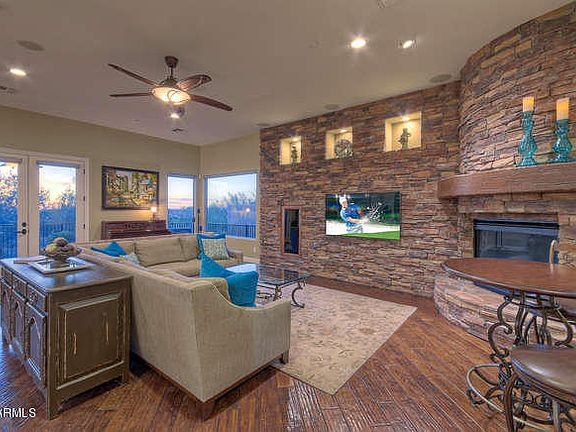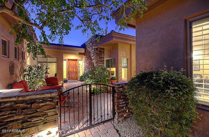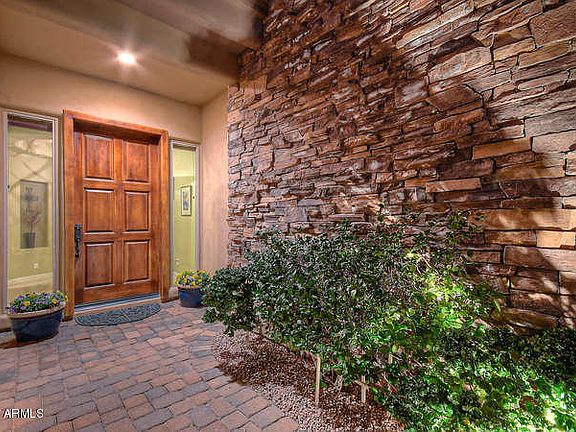 EXCEPTIONAL PRICE AND UNIQUE OPPORTUNITY! This architecturally distinctive home is in perfect condition with many recent upgrades. Popular floor plan features 4 bedrooms, 3.5 baths and separate office. Large guest house is unique with a private courtyard entrance, full bath and living area. Luxury finish includes hardwood and Travertine flooring, stone accents with custom wood mantle and designer lighting. Beautiful kitchen has an expanded island with custom cabinetry, high-grade granite slab, upgraded appliances, wine refrigerator, and motion activated faucet. Over-sized master bedroom has private patio access and beautiful sunset views. Spacious master bath with stone surround and walk-in closet. Private spa with stacked stone, waterfall and gas fire features. Aggressively priced!