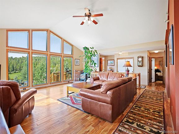Welcome to 10797 Snowy Trail, a meticulously maintained 3-bedroom, 2-bathroom mountain retreat nestled on nearly two acres of aspen-dotted landscape in Conifer. A seasonal stream and mature aspen grove extend through the property, creating a private sanctuary under ten minutes from Highway 285 for easy commuting and the amenities of Conifer’s shops and restaurants. Tucked away in a charming enclave of homes between Oehlmann Park and Hilldale Pines, this residence balances community character with peaceful seclusion. Lush landscaping includes a fully fenced grassy yard, raised garden beds, and meandering wraparound decks that invite morning coffee or evening stargazing. Inside, an open floor plan greets you with soaring ceilings, oversized south-facing windows and custom blinds that welcome winter sun while keeping summer days cool and shaded. A wood-burning stove anchors the living area, adding rustic warmth on crisp Colorado nights. Recent upgrades feature a high-efficiency furnace, newer windows and doors, modern kitchen appliances, Acacia hardwood floors on the main level, and luxury vinyl plank flooring upstairs and throughout the lower level. The attached two-car garage offers extended workshop space for projects or gear storage, complemented by a large storage shed and an additional shed for firewood or tools. A private well supplies all indoor water needs allows for watering domestic animals, including horses—making this property ideal for equine enthusiasts or anyone dreaming of a hobby farm. Pride of ownership shines in every detail, from the carefully tended gardens to the thoughtful modern updates. This rare Conifer offering delivers mountain charm, functional amenities, and enduring value. Don’t miss your chance to call 10797 Snowy Trail home.