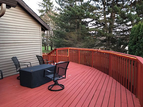 Beautifully remodeled! Greatroom layout. Kit: marble counters/cook-island, BI Oven and micro, hardwoods, eating area, pantry, opens to fam rm w/elec FP, slider to spacious wrap-around deck. Liv rm: bay window, vaulted. Din rm: tile floor. Den/office on main. Master Suite: tile floors/walls, 2 vanities, jetted tub, skylight, WI shower, WI closet. Remod guest bath: tile floor/counter, skylight. Quiet neighborhood and corner lot!